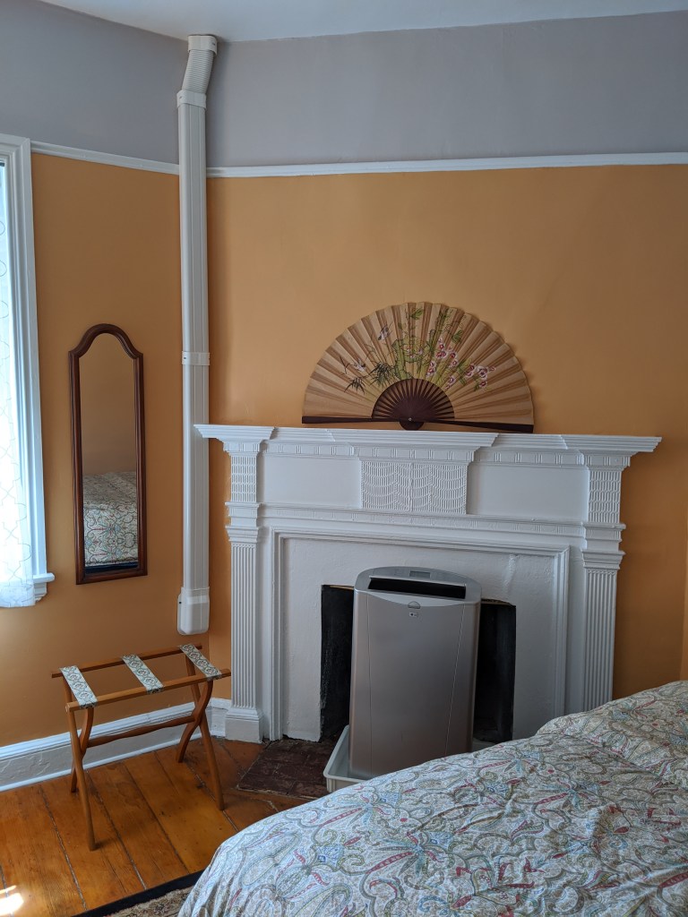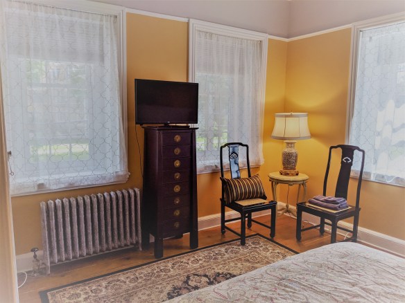 This room shares a full bath with one other guest room. The bathroom is conveniently a few steps down the hallway – the hall outside the bath is also where you will find additional towels. The shared bath offers basic toiletries and a hairdryer.